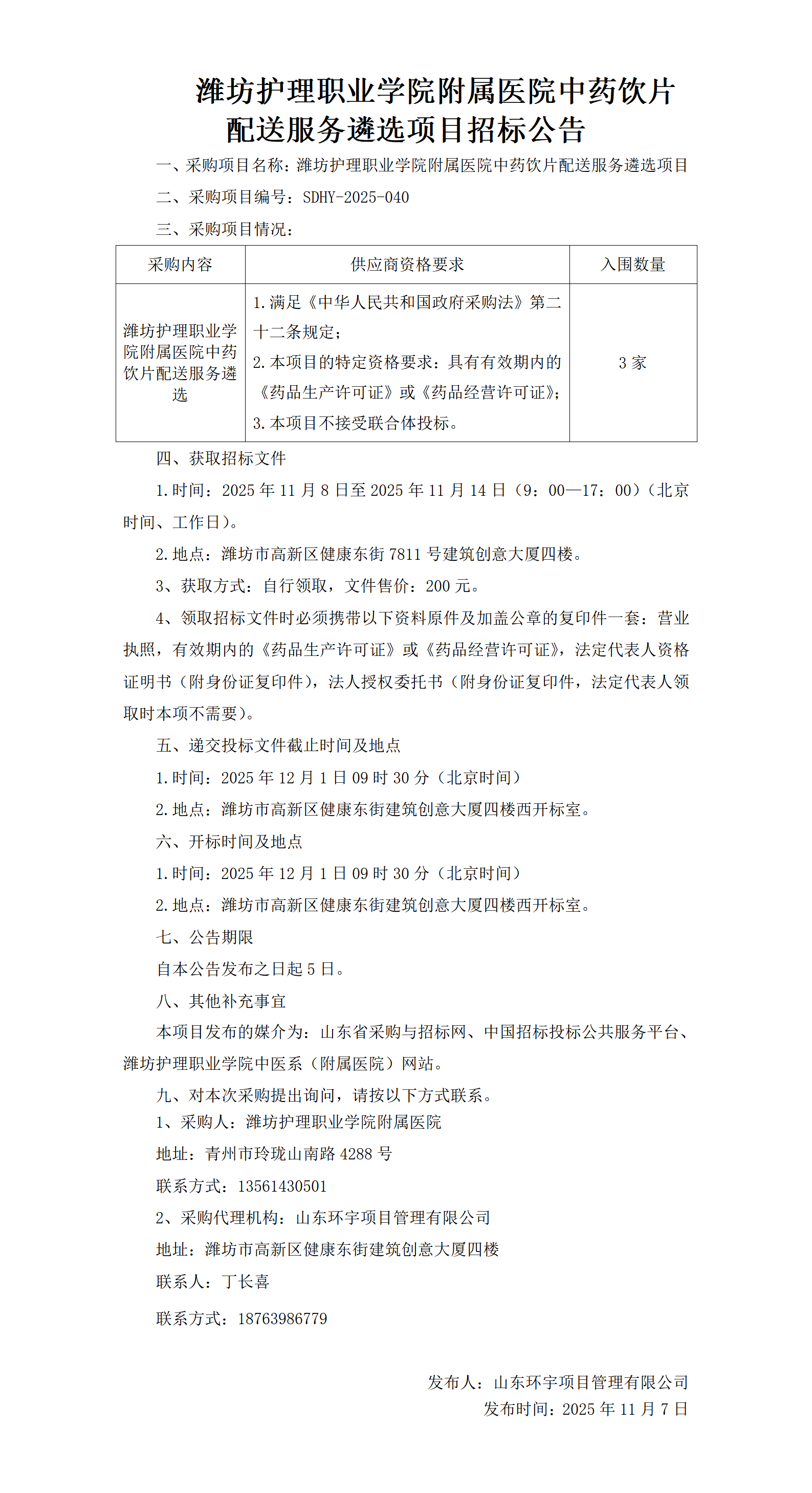 潍坊护理职业学院附属医院中药饮片配送服务遴选项目招标公告