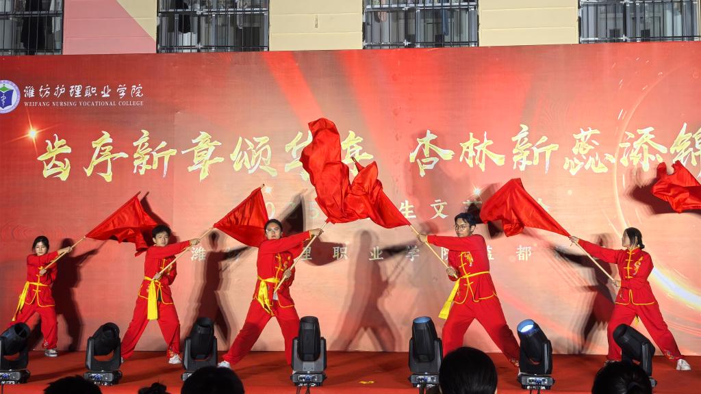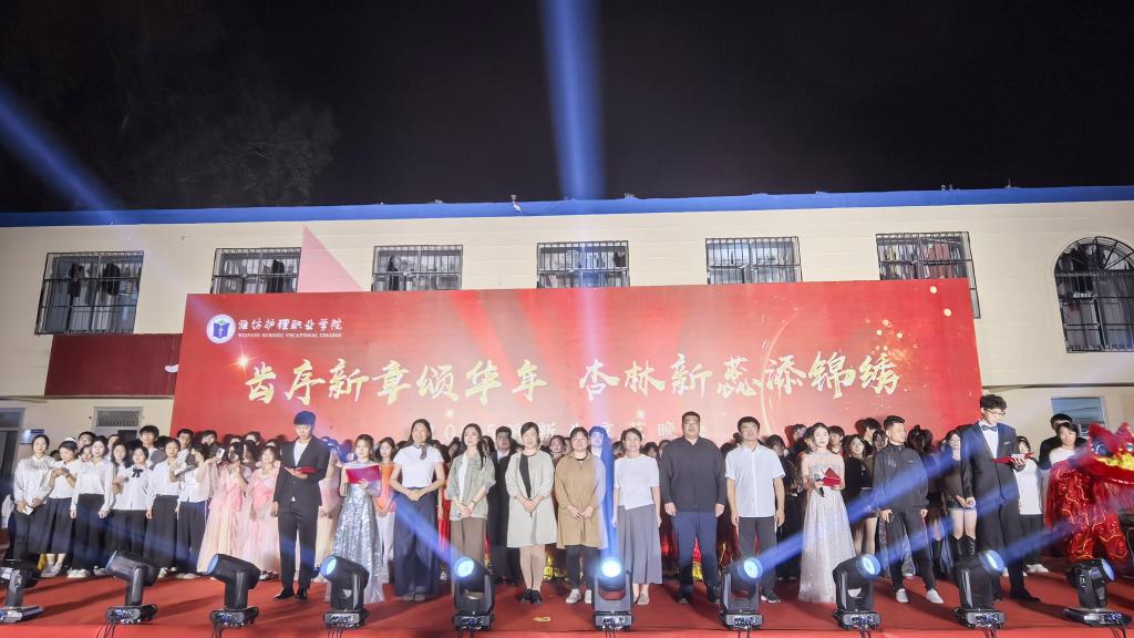 晚会在乐队的超燃节奏中震撼开场。12个自编自演节目轮番登台:歌舞《一起向未来》以跃动旋律展现潍护学子昂扬风貌;教师代表深情献唱《我爱你中国》,引爆全场爱国热情;小品《体检警告》用幽默桥段传递健康科普;朗诵《八秩荣光 青春誓言》铿锵有力,许下青春报国志;古风舞蹈《三拜红尘凉》尽显传统文化之美;合唱《如愿》唱出对先辈的敬意与对未来的希冀;拉丁舞《Toca Toca》、爵士舞《Sexy Back》用动感节奏诠释青春自信;压轴节目《美丽中国》携手舞狮腾跃,以歌声与鼓点共绘山河锦绣,将晚会推向最高潮。