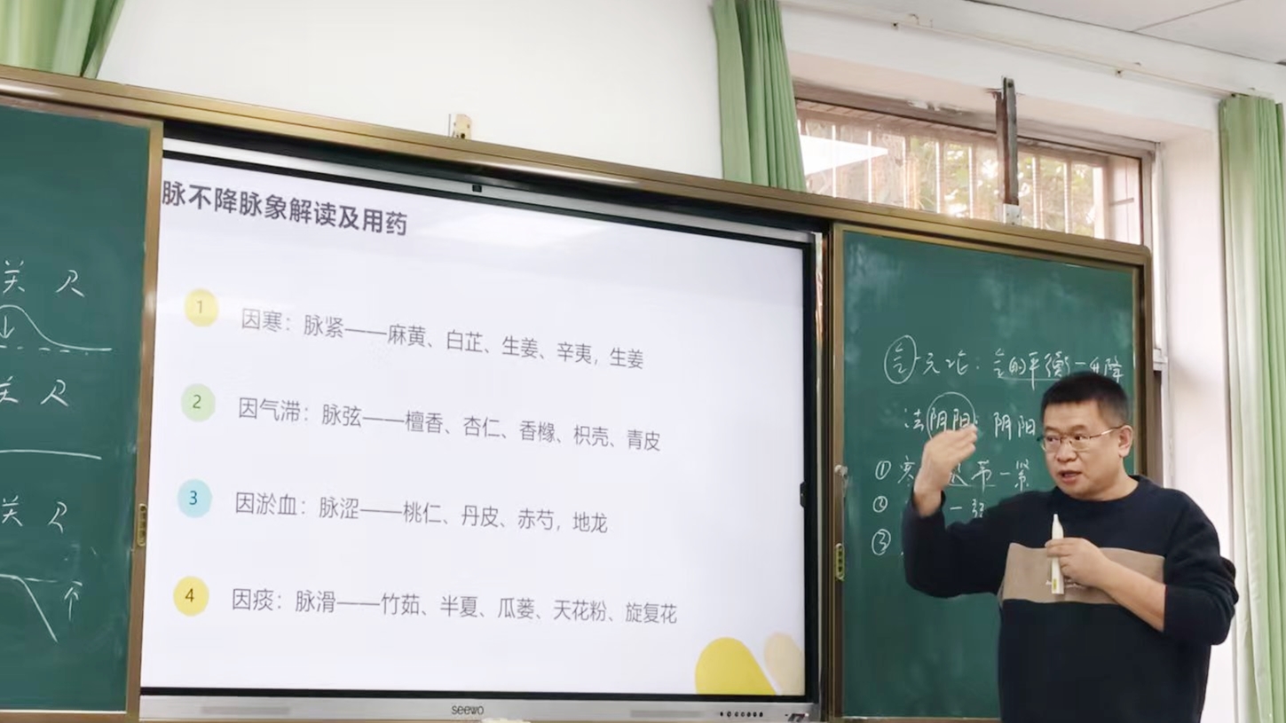 讲座中,张世文围绕“升降出入无器不有”“守一元而法阴阳”两大核心板块展开深度剖析,将《黄帝内经》等经典理论与现代临床实践紧密结合。在“升降出入无器不有”板块,张世文引述《黄帝内经·素问》中的经典论述,指出人体健康的关键在于维持气血升降出入的动态平衡。当这种平衡被打破时,脉象便会随之起伏。为帮助听众直观理解,他现场绘制了6种临床常见脉象起伏示意图,并结合具体病例详细讲解,使抽象理论变得生动可感。在“守一元而法阴阳”板块,他从“辨阴阳第一”和“阴阳互比第二”两个部分展开论述。在“辨阴阳第一”部分,他引用“善诊者,察色按脉,先别阴阳”的经典观点,指出人体阴阳可划分为上下、左右、内外、前后四对关系,并在脉诊中具体落实为上下、左右、内外三对阴阳。在“阴阳互比第二”部分,他强调平人脉象并非某种固定形态,而是通过阴阳互比法则剖析出的平衡状态,其核心是“阴平阳秘”。他指出临床疾病千变万化,但治本之法在于调和气机升降出入、平衡阴阳,最终达到“阴平阳秘,精神乃治”的境界。张世文还结合临床案例,深入分析气机失衡的原因,解读常见脉象特征,并剖析中药应用规律,为听众提供了实用的诊疗思路。