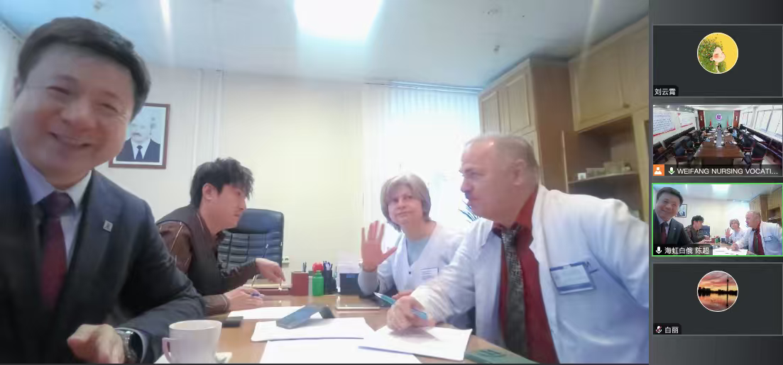 近日,潍坊护理职业学院联合白俄罗斯共和国康复中心、白俄罗斯海虹医疗科技有限公司召开“白俄罗斯—岐黄学堂”工作推进会暨白俄罗斯中医药需求研讨会,双方就“白俄罗斯—岐黄学堂”中医适宜技术海外推广交流实质性建设展开深度磋商,标志着双方在中医药职业教育海外推广迈入落地实施新阶段。白俄罗斯共和国康复中心院长帕采耶夫•亚历山大、白俄罗斯共和国康复中心慢性疼痛中心主任苏珊娜•伊琳娜、潍坊护理职业学院党委委员苗光盛参加会议,会议由潍坊护理职业学院中医系主任郑硕主持,双方相关部门负责人及核心骨干参会。