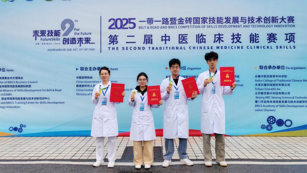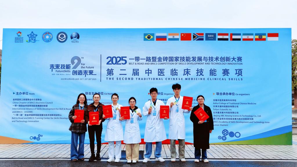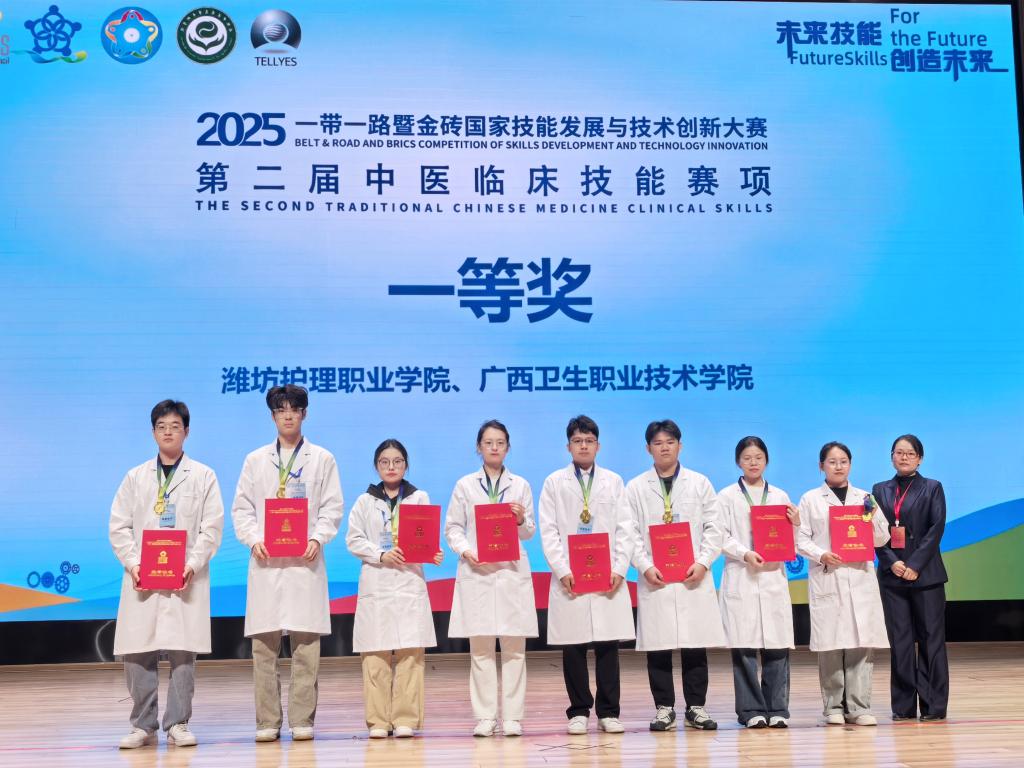 10月23至26日,2025“一带一路”暨金砖国家技能发展与技术创新大赛第二届中医临床技能赛项在安徽中医药高等专科学校成功举办。本次大赛由金砖国家工商理事会中方理事会、一带一路暨金砖国家技能发展国际联盟、中国科协“一带一路”暨金砖国家技能发展与技术创新培训中心主办,中国发明协会、教育部中外人文交流中心联合主办,吸引了来自全国19个省、市、自治区的49支代表队同台竞技。经过激烈角逐,潍坊护理职业学院凭借出色表现荣获一等奖和“最佳组织奖”,刘云霄和李宁老师获评“优秀指导教师”称号。