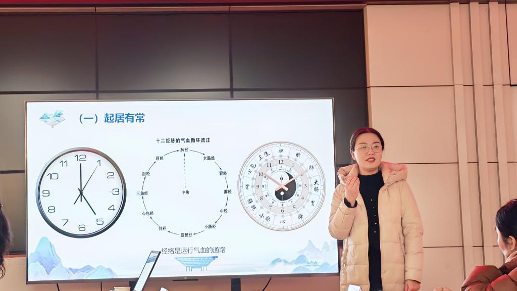 讲座围绕“体质辨识”“中医生活化养生方式”“中医药+文旅融合”三大模块系统展开。张倩老师首先引导大家进行体质辨识,详细介绍了九种体质的特征与表现,帮助职工从中医角度认识自身健康状态。随后,从“起居有常、饮食有节、适度运动”三个方面,系统介绍了中医生活化的养生方法。她结合十二经脉与作息规律,阐释了顺应自然的重要性;针对不同体质,推荐了相应的药膳食疗与茶饮方;现场带领大家体验了传统养生功法“八段锦”,并讲解了合谷等常用保健穴位的按摩方法,以及益肾强体的实用技巧,让职工在互动中感受中医养生的魅力。最后,基于“中医药+文旅”融合发展的前景,张老师提出了开发康养旅游路线、建设文化体验基地、开展中医研学活动、打造特色养生产品等四项合作建议,紧密结合青州本地中医药资源与旅游文化优势,为双方后续合作提供了清晰路径。