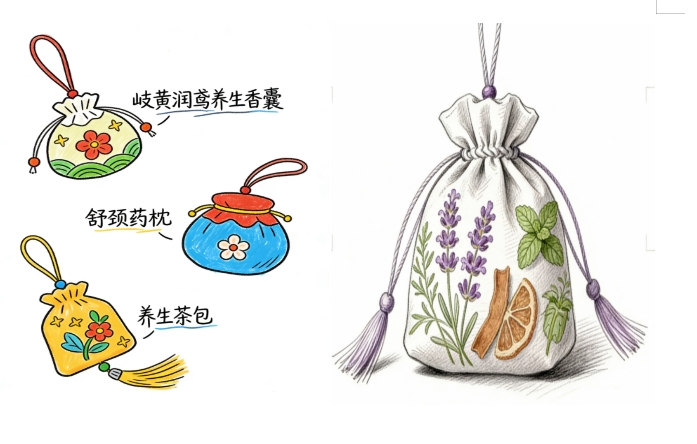图为“岐黄文创我设计”创意征集活动:学生围绕“岐黄润鸢”品牌,设计养生香囊、药枕等文创产品,让中医文化以更鲜活的姿态传播。